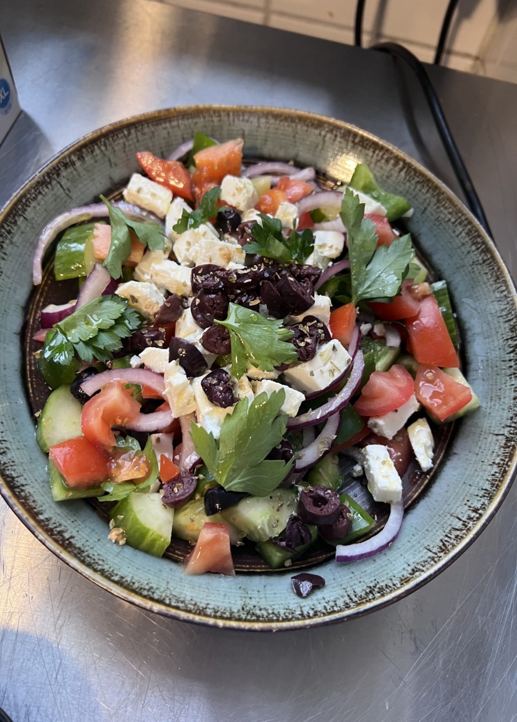 Agurk, tomat, løk, olivenolje, grønn paprika fetaost, basilikumkrydder, salt, oliven, persille og brød