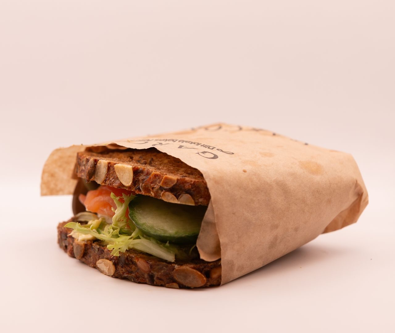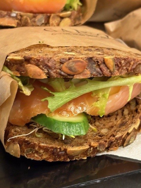 To skiver med vårt rugbrød, fylt med røkt laks og egg i skiver, salat, agurk og spirer